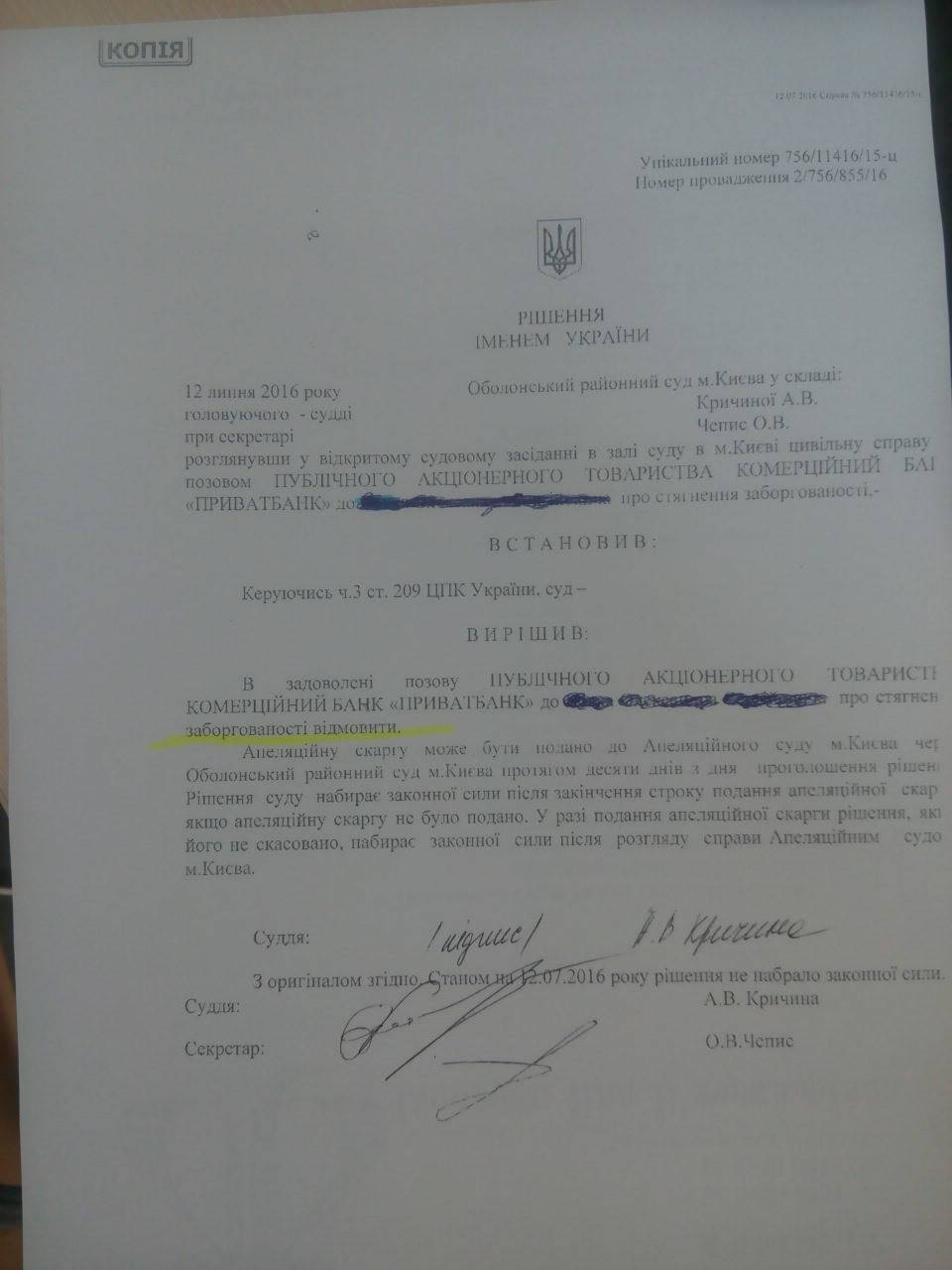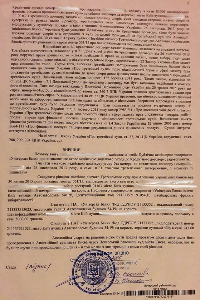 В случае подписания договора с финансовой организацией на несправедливых условиях или условиях противоречащих действующему законодательству, такие условия в судебном порядке могут быть признаны недействительными. Решением Печерского районного суда было признано пункты кредитного договора и дополнительного соглашения недействительными.