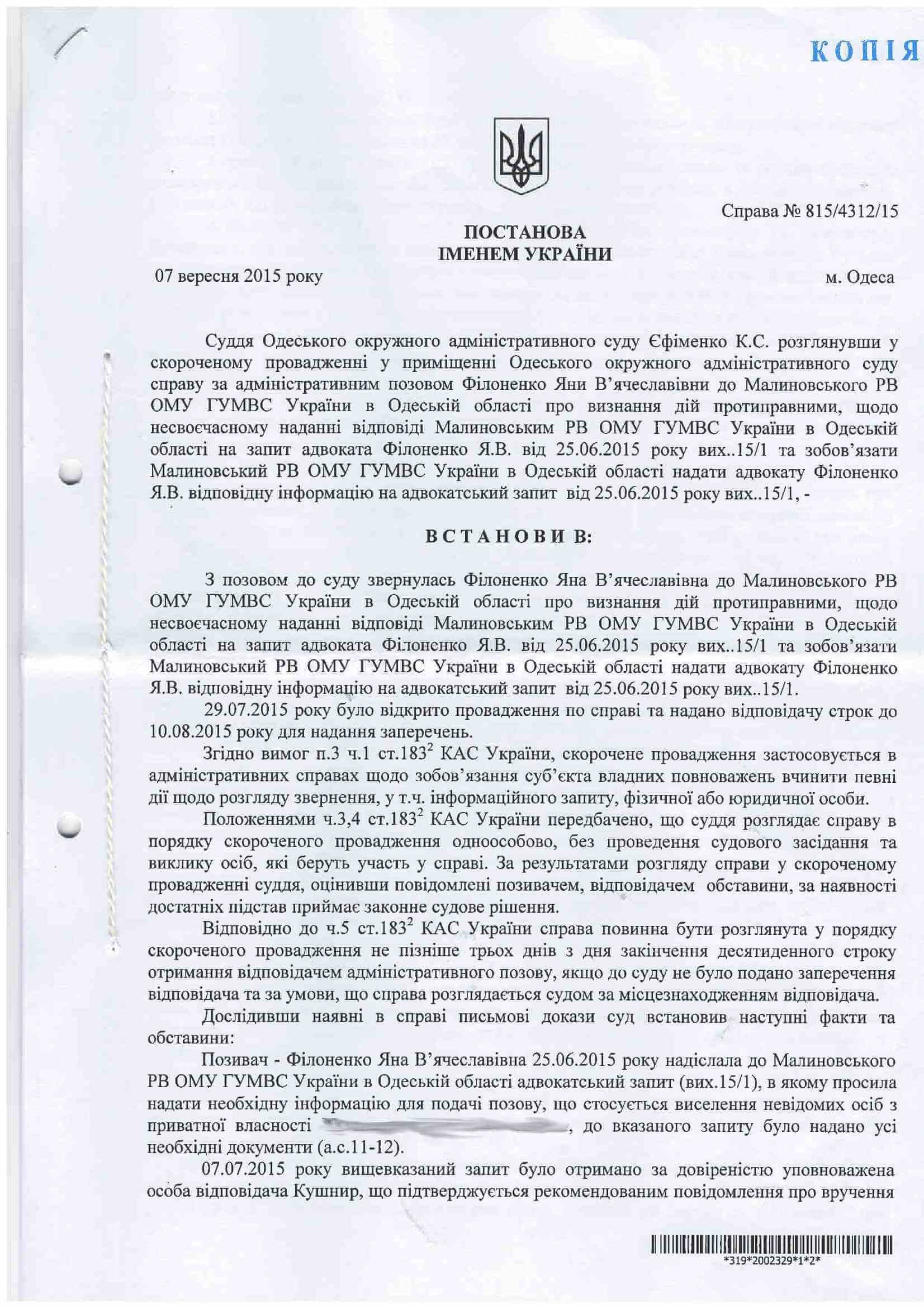 В силу ст. 24 Закона Украины «Про адвокатуру и адвокатскую деятельность» государственные органы и другие учреждения обязаны дать ответ на запрос адвоката в течении 5 дней с момента получения запроса. В данном решении административный суд обязал Малиновський РО ОМУ ГУМВД Украины в Одесской области дать ответ на мой адвокатский запрос, в котором я просила предоставить всю необходимую информацию, относительно личностей, незаконно проживающих в квартире моей клиентки, для подачи иска в суд.