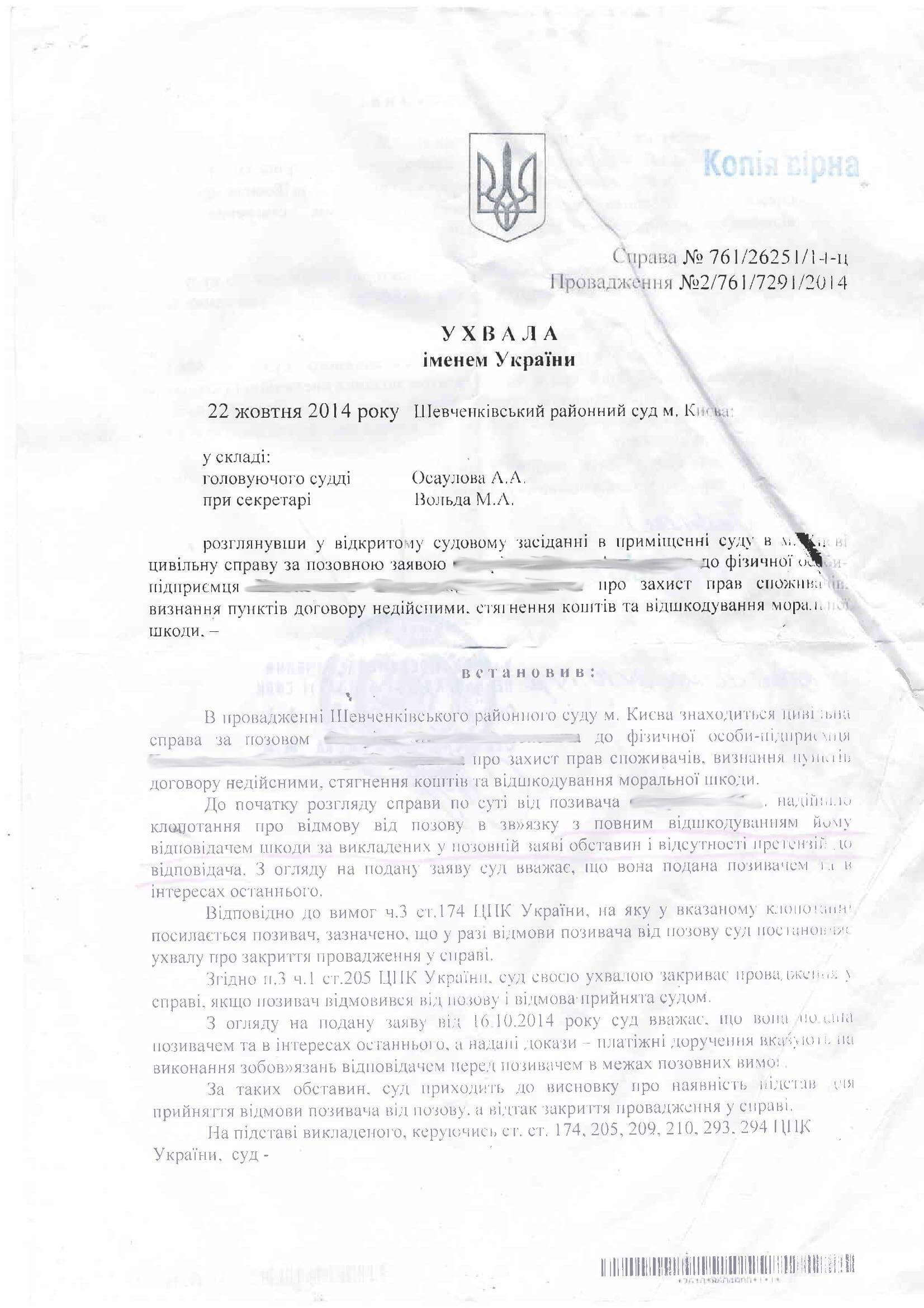 Этим постановлением суда было закрыто производство по делу моего клиента, который оплатил агентству 600 долларов США за трудоустройство в Америке. После подачи иска мною было проведено ряд переговоров с недобросовестным посредником работодателя, в результате чего деньги были возвращены в полном объеме и даже компенсирована юридическая помощь. От иска о признании договора недействительным клиент отказался.