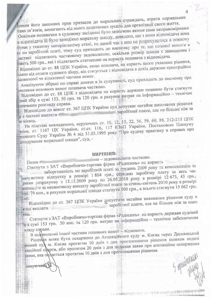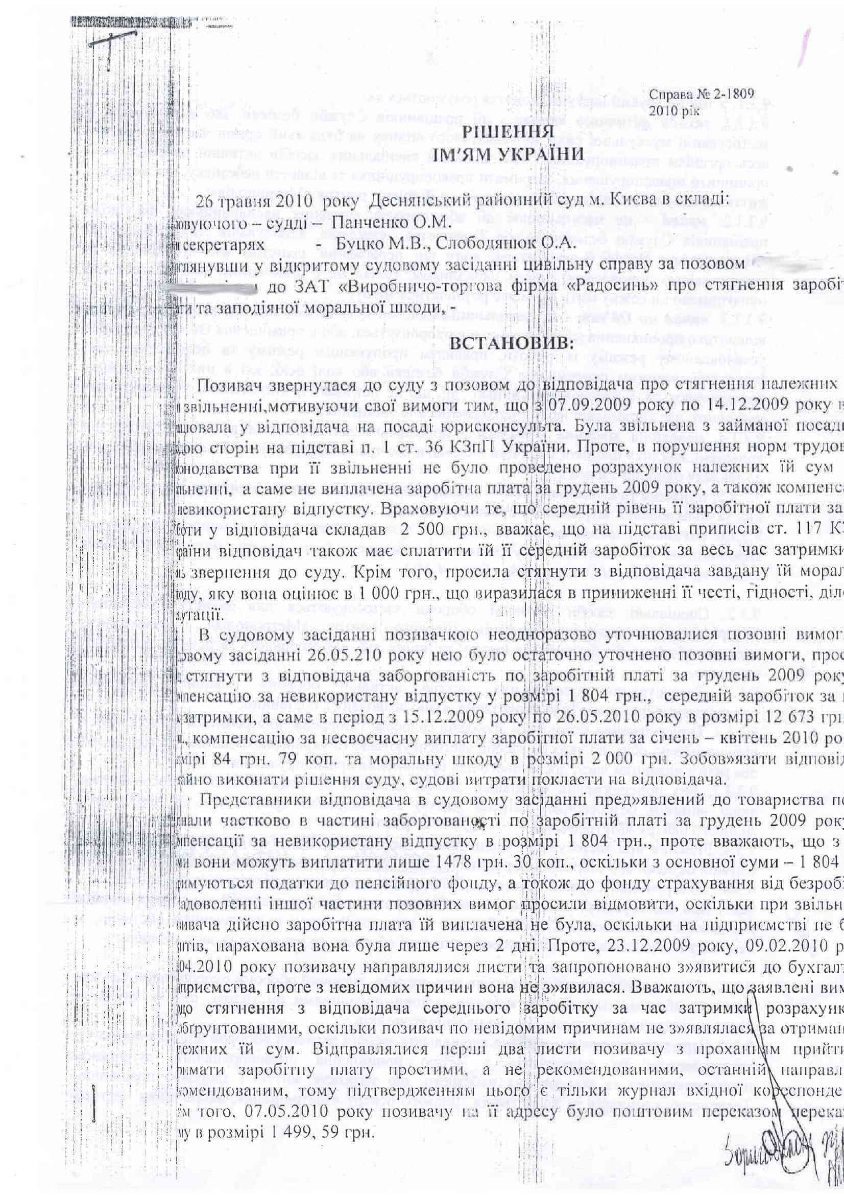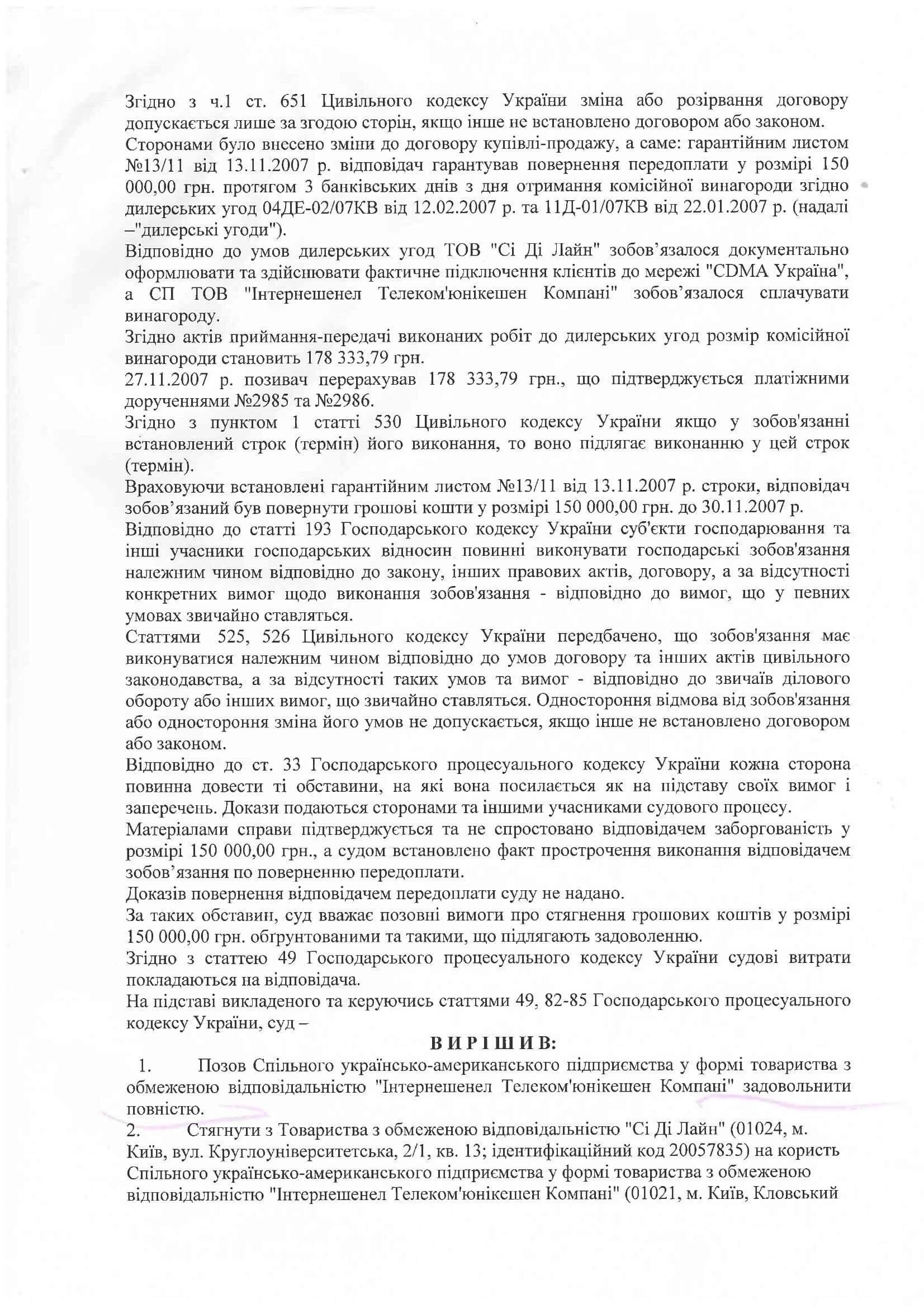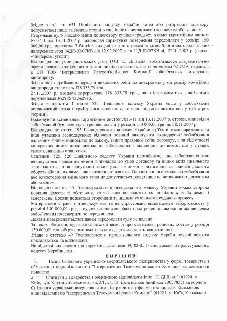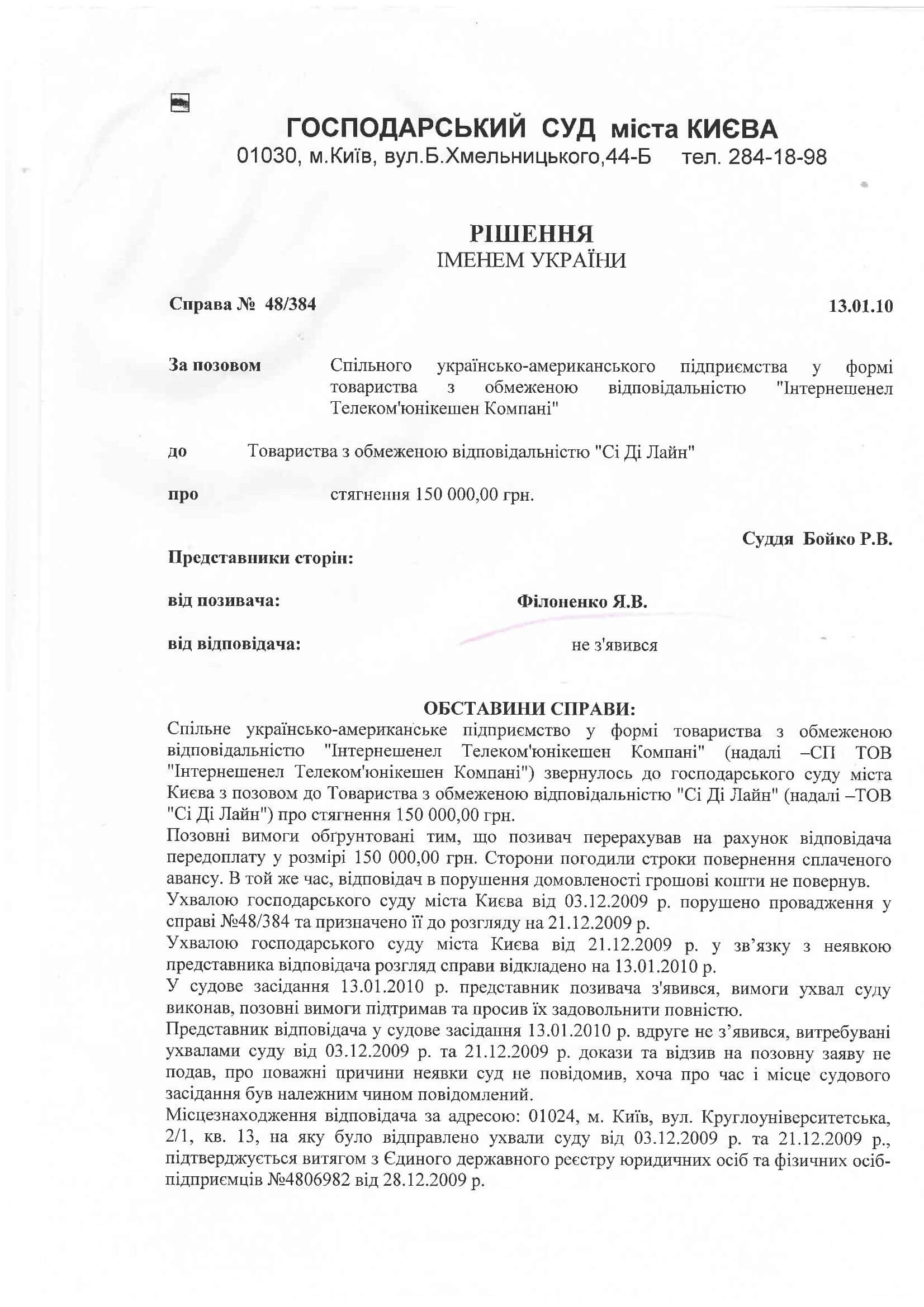 ООО «Си Ди Лайн» не возвратило аванс, уплаченный моим клиентом (юридическим лицом) за оказание дилерских услуг, которые не были оказаны. Данным решением суда было присуждено 150 000 грн. в пользу юридического лица, интересы которого я представляла.